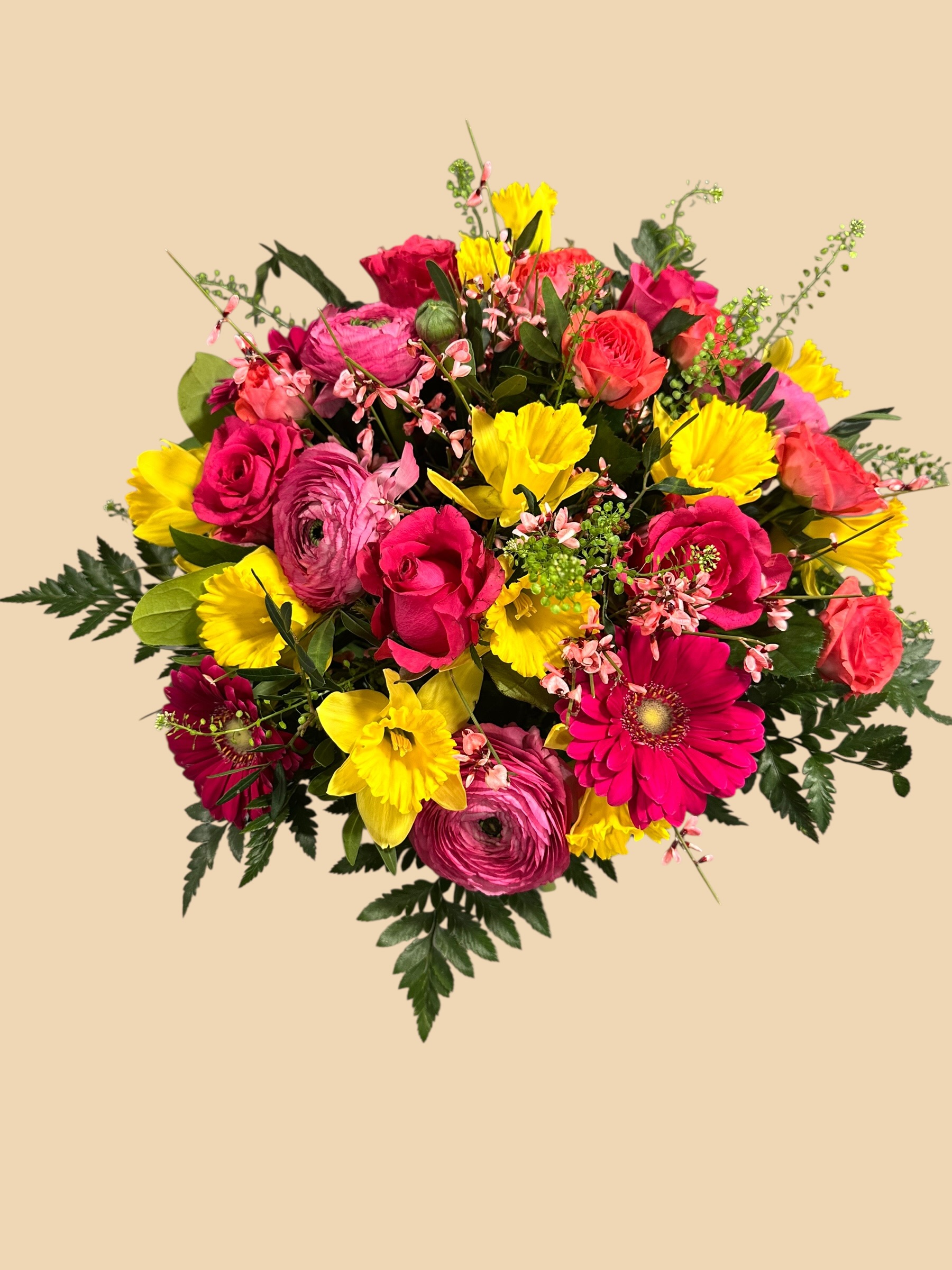 Ce bouquet éclatant composé de renoncules gerberas jonquilles roses branchues genet parfait pour célébrer la fête des grands mères , un anniversaire ou simplement faire plaisir avec couleur et bonne humeur